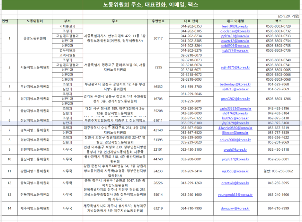 물론 우편, 방문접수, 팩스를 통한 민원 신청은 평소와 같이 가능하지만, 임금체불 등 노동관계법령 위반 관련 노동부 진정은 관할 지방관서 대표 메일로, 부당해고나 부당노동행위 등 노동위원회 사건은 각 지방노동위원회 대표 메일로 접수하실 수 있어 대표 메일 주소를 포함한 각 지방고용노동관서 및 노동위원회 연락처를 안내드립니다.