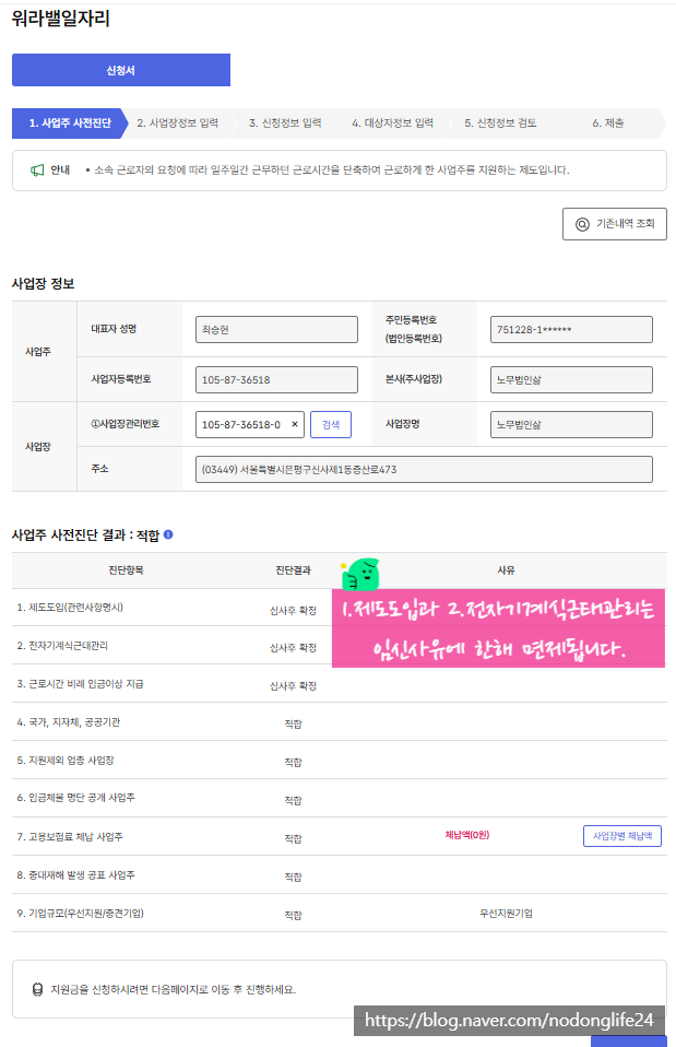 자동으로 사업장 정보가 뜨고 지원 가능한 사업장인지 사전 진단 결과가 나옵니다. 정보가 올바르면 다음을 클릭하여 지원금을 신청하러 갑니다.