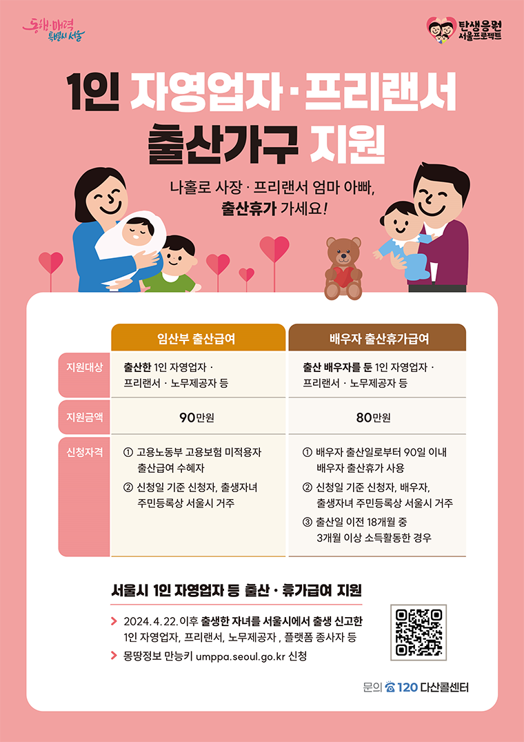 서울시는 고용보험 지원 150만원에 추가로 90만원(다태아 임산부는 170만원)을 지원해 총 240만원(다태아 임산부는 320만원)의 출산 급여를 지원한다고 합니다.
