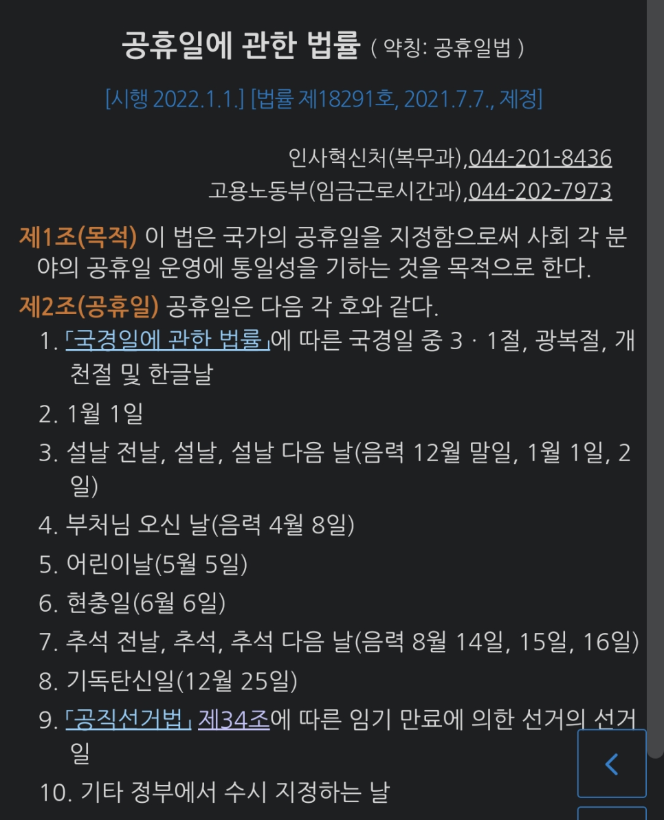 2022년까지 공휴일은 관공서 직원들만 쉴 수 있는 날이었으나, 장시간노동 그만하고 쉴 때 같이 쉬자는 취지로 2022년부터는 5인이상 민간 기업에도 적용되어 '유급 휴일'이 되었습니다.