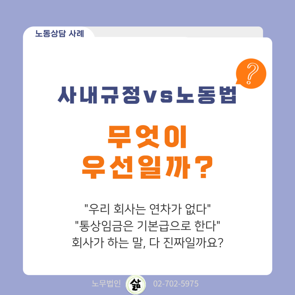 따라서 사내규정에서 법보다 못한 근로조건을 정하고 있더라도 근로기준법이 우선합니다.